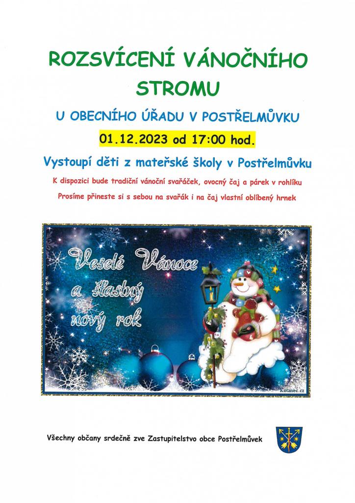 Dne 01.12.2023 jsme v 17:00 hod. rozsvítili vánoční strom v Postřelmůvku a děti z místní mateřské školky pak svými koledami roztančily padající sněhové vločky. Každým rokem se nás schází o něco víc. Krásná tradice, při níž se letos vypilo 60 litrů svařeného vína.